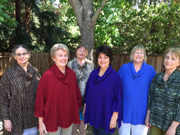 A group of women met in Jane's studio for a fun day of sewing a new style shirt. Jane had drafted the pattern, and students worked with Jane to determine sizing. They then spent the day making the garment. The seams were all serged. By the end of the day, they were ready to have their photos taken.