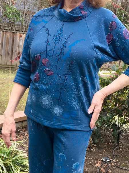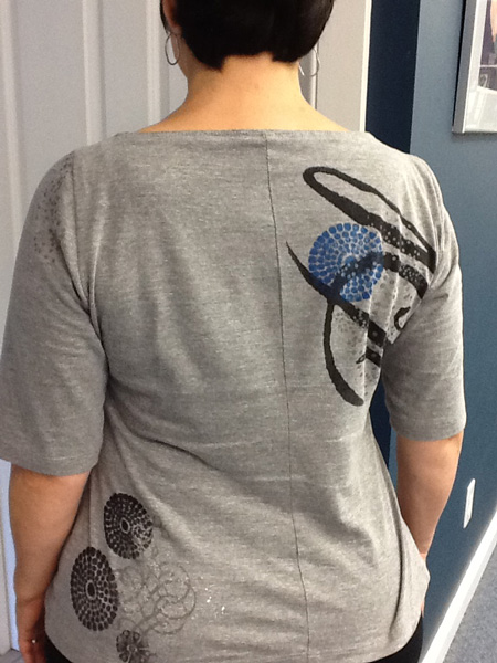 Sally made this really cute top and enhanced the fabric with silk screening details. The pattern is Pearl Knit Top by StyleArc