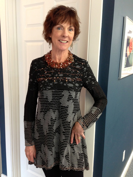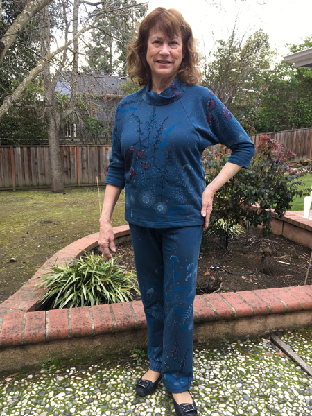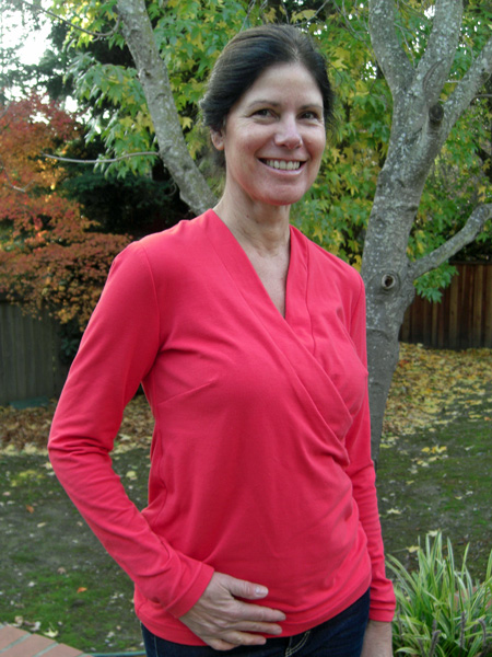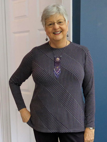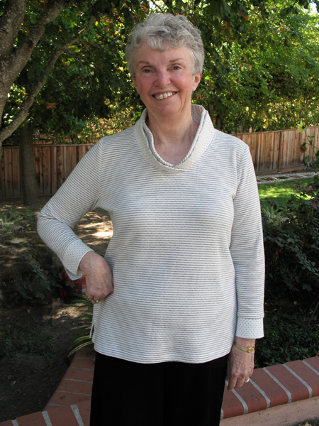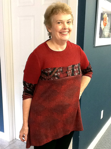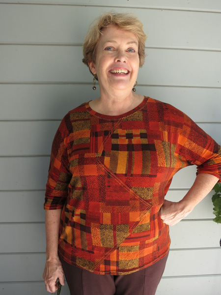 Pat looks great in her new knit top. She used Vogue V8856 for the pattern.
