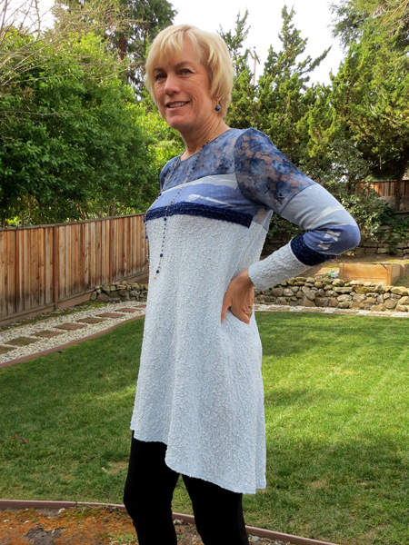 This gal looks great in everything she makes. This tee is an adaption of Marcy Tilton pattern Vogue V8582 with an extension at the side. Jeanne added the extension to both side seams. She used a great open mesh fabric as an outer layer, and bound the edges beautifully with the tee shirt fabric used for the inner layer.