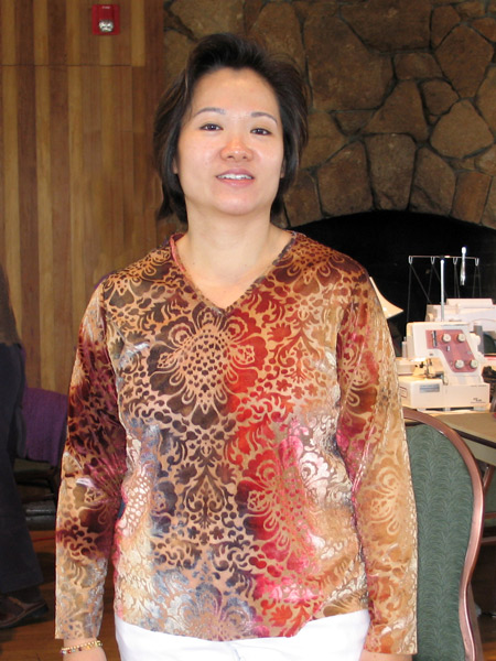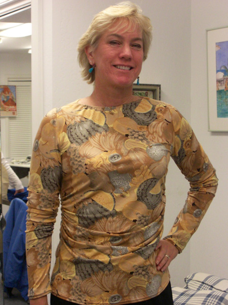 Sharon is wearing a rayon/lycra tee shirt. Jane made the princess line pattern by draping fabric on her while she attended a Sewing Retreat