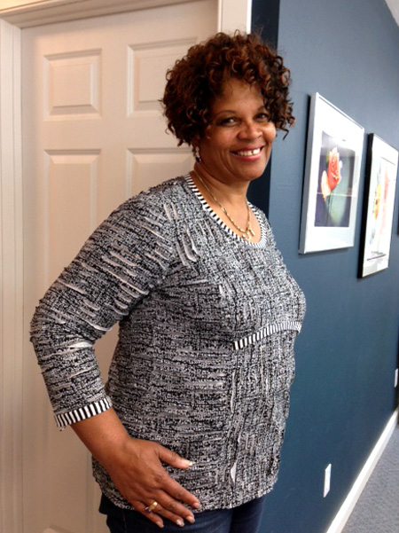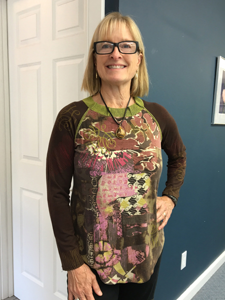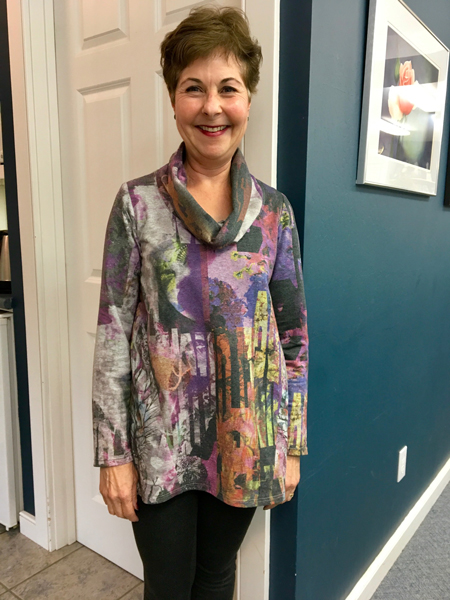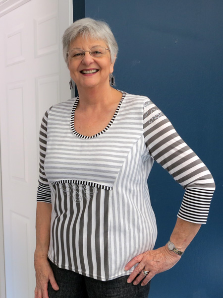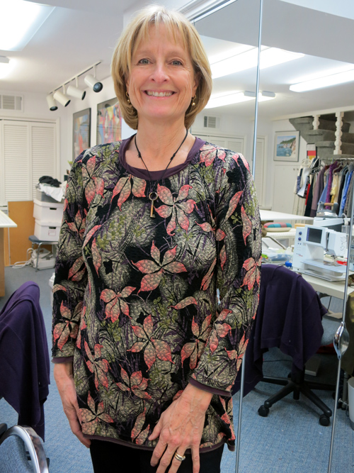 Joy looks fabulous in this top she made using three different coordinating fabrics from Marcy Tilton.