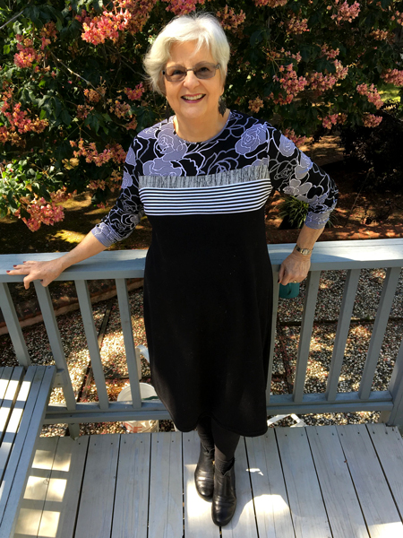 Here's Vicki who finished her pretty knit dress. She worked so well on it. The pattern is one Jane made from one of her knit ready to wear dresses. Vicki used a variety of knits and stripes, and she does look wonderful!.