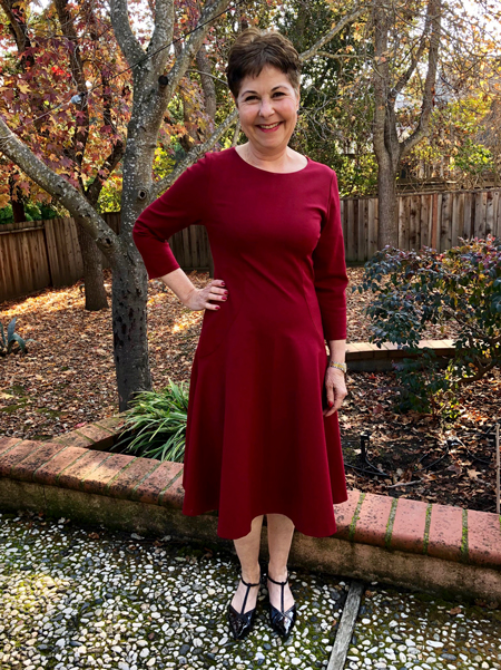Vicki Z is wearing her latest dress made in a red ponte knit. It slips over the head and has a beautiful full skirt. The pattern is Vogue V8871.