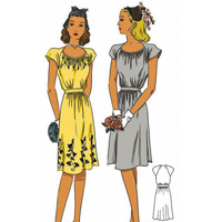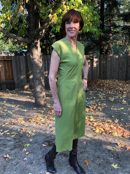 Jeanne made this Decades of Style Belle Curve dress using silk noil. It has 40 darts making up the curve from the side of the bust to the back. It has gathering below the waist at the center back.
