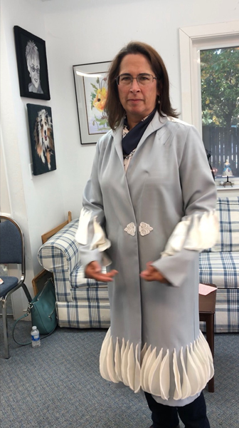 Ellen S. created this Decades of Style Parisienne coat! The fabric is linen with a gold sheen. She and Jane lengthened the pattern as she wanted the flounce lower. The very very special button is backed with a snap closure.