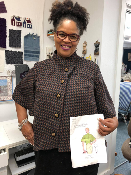 Susie used the Decades of Style #3009 1930s Capelet for the Sewing Challenge. The buttons are gorgeous and she bought them in Paris. Everyone wanted to try on this capelet and loved it. It’s basically a sleeveless jacket with a short cape.
