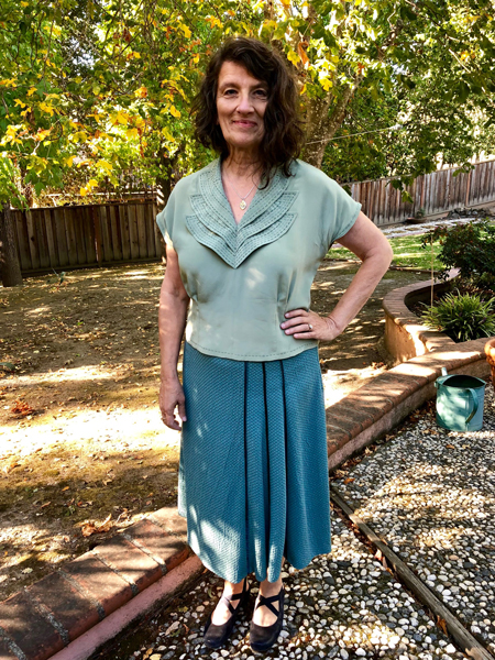 Her skirt is Decades of Style #3011 1930s Stardust Skirt. The fabric is a textured rayon also from her stash. The three front seams on the skirt are piped beautifully.