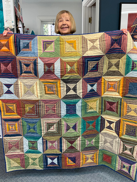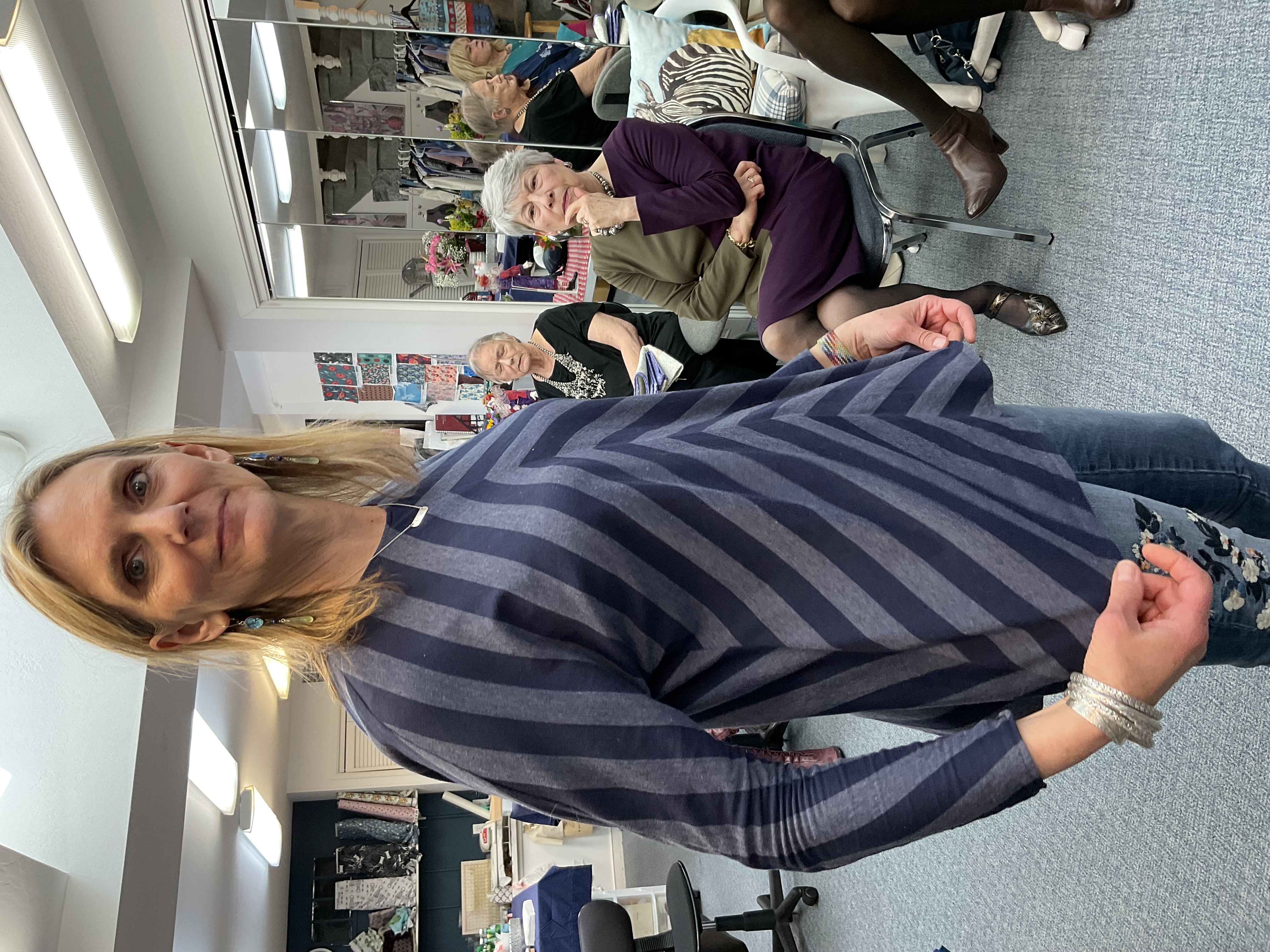 JoAnn B is wearing a tunic she made for Jane's stripe challenge. The pattern was by Saf-T-Pockets She perfectly matched the stripes down the center front.