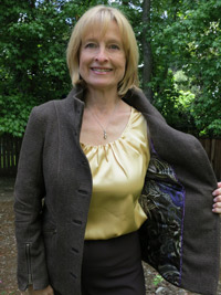 Susie liked Jane's Marfy jacket 2257, and decided to make one for herself. She used a Louis Vuitton fabric she found in Paris. It is a very unusual fabric with a slightly metalic look, and she lined the jacket with champagne colored silk charmeuse.