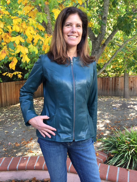 Janice selected her teal colored leather from The Hide Housein Napa, CA. She lined her jacket with a rayon print and underlined with cotton flannel for warmth.