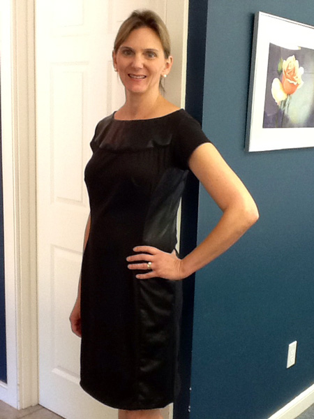 Katherine purchased faux leather and a black knit fabric from Stone Mountain and Daughter Fabrics, and she made this dress for Jane's leather challenge. She used the leather for the side panels and the front yoke.
