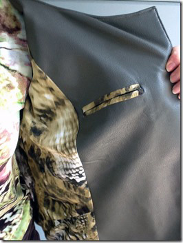 Vicki E completed her amazing leather jacket. The rich brown leather came from The Hide House in Napa, and she used a Marfy Italian pattern. There were many couture techniques used with the making of this jacket. It is an amazingly beautiful jacket.