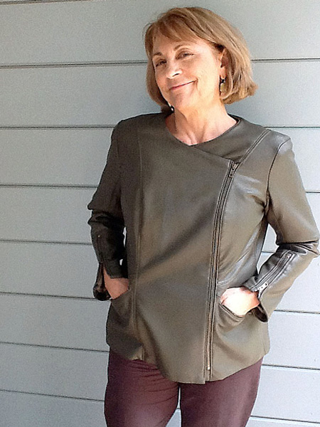 Jane selected StyleArc's "Ziggi" pattern for her lavendar leather jacket. She is also wearing coordinating slacks made in a ponte knit from Stone Mountain and Daughter Fabrics.