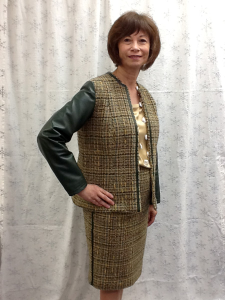 Patti made a wool jacket in the Chanel style. She lined it with silk charmeuse and used leather on the sleeves and trim.
