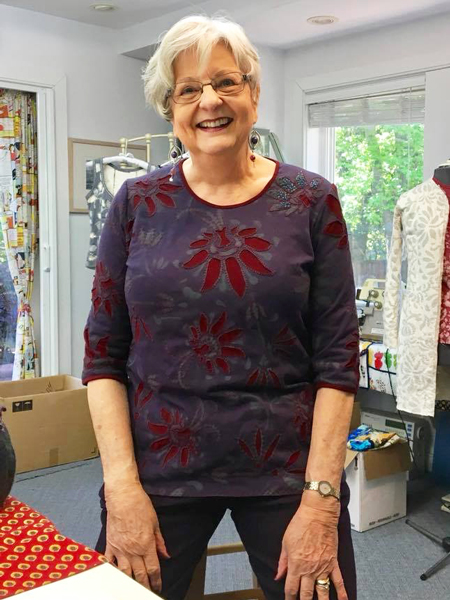 Joy used a combination of cotton from Alabama Chanin and fabric from Stone Mountain and Daughter Fabrics. Jane's Big Shirt top pattern was used and she modified the collar. The design came from a book by Alabama Chanin. Laura made a stencil of the design. She airbrushed the black paint on the fabric, and then used yellow thread to outline the design. This her favorite top and she wears it a lot.