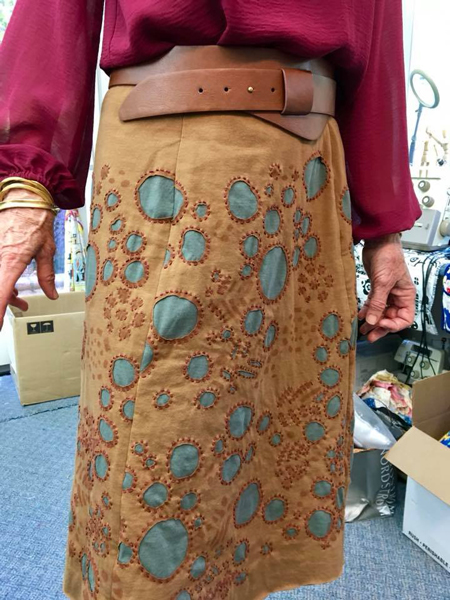 Vicki finished her beautiful Alabama Chanin style skirt. She used an orange knit layer and a beige knit layer. The skirt was screened and then embroidered. Vicki loves this skirt