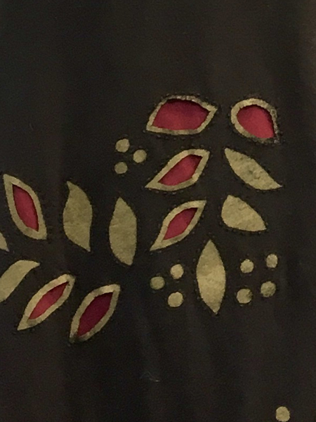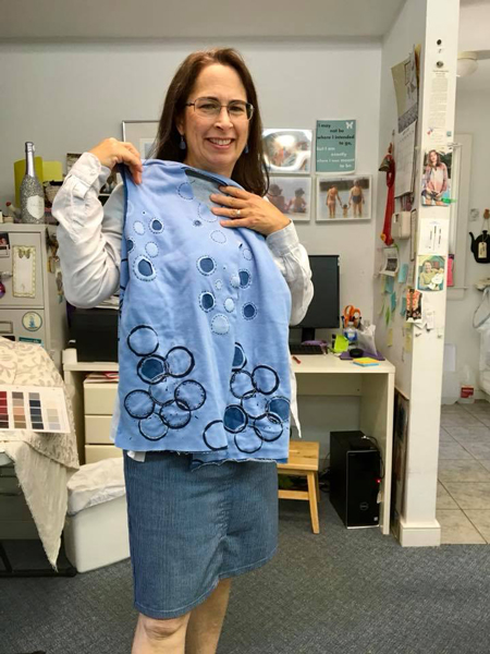 Laura used 2 layers of 100% cotton from Alabama Chanin. She stenciled the design on using a screen and design from Alabama Chanin. Using a foam brush, she stenciled each design by hand. When the design was dry it was thick, but after stitching and cutting away most of the painted fabric except the outline, it became truly a work of art.