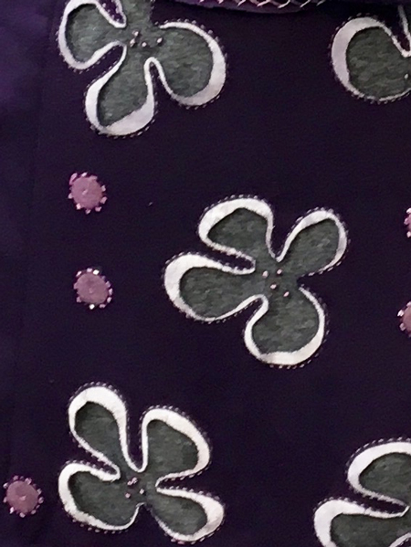 Jane used one layer of Alabama Chanin cotton and one layer of rayon knit. She used an Alabama Chanin stencil purchased by Diana, and airbrushed the design onto the fabric. The stitching is running and back stitches with a few beads added.