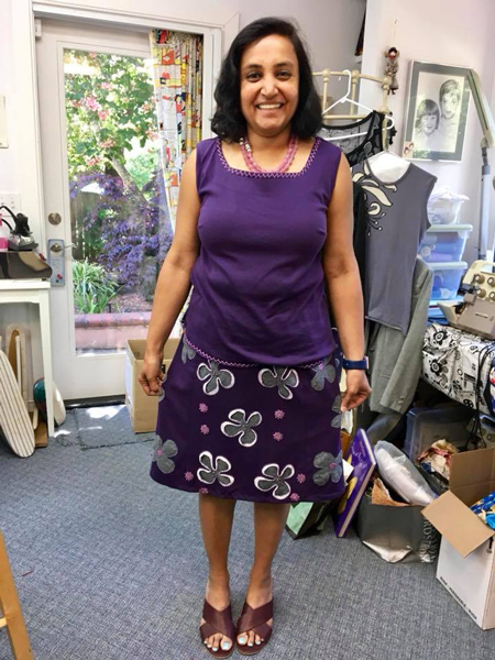 Vandana made this cute skirt in 4 panels. Two panels were made using reverse applique and two were made with applique. She used one of Jane's silk screens and added embroidery and beads. She made a top to go with the skirt.
