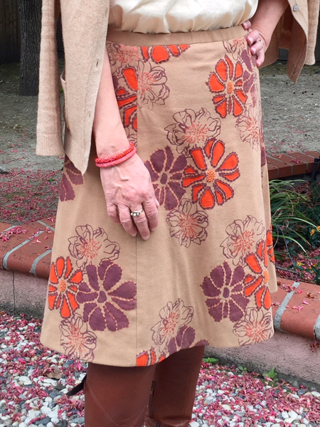 Maria made a Alabama Chanin style skirt. She designed the motif for the silk screening, and screened using different colored paints to get this Fall effect. Sally Baker made the silk screens (visit her on Etsy here).
