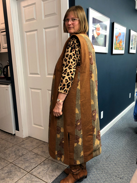 This fun vest is Vogue V9135. Barbara used a shiny rayon, and the drawstring ties are a nice design feature. She’s already enjoyed wearing it on one of her cruises.