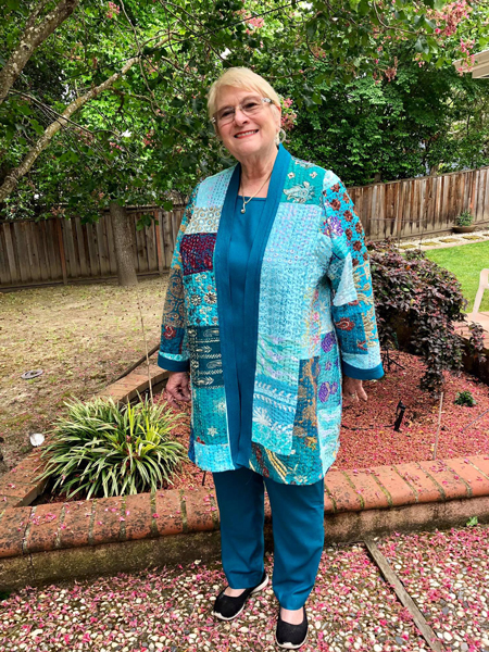 Diana just finished her coat made from a Kanta quilt. It looks so good on her, and she loves it. She bound all the edges and inside seams with silk dupioni. She used a Loes Hinse pattern.
