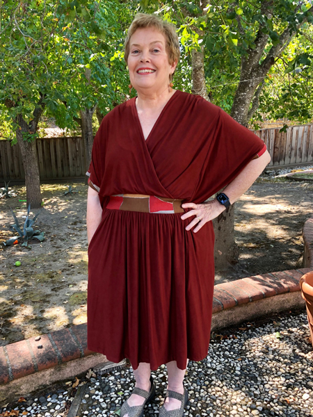Vicki made this comfortable knit dress using StyleArc's Lacey Dress pattern. The fabric is double sided strip and polka dot. During fitting, Jane took in some soft tucks in the skirt to make it fit closer to her body.