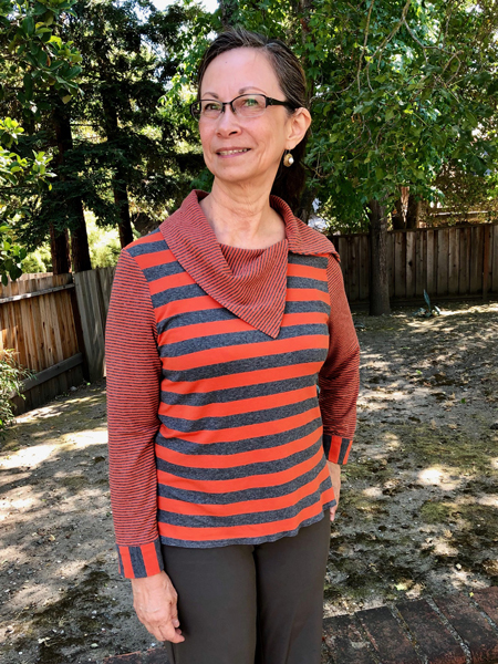 Thea looks good in her new top. She used a printed knit and a StyleArc pattern. She added a twisted band to finish the neckline.