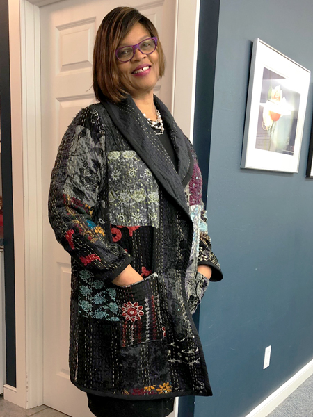 Liddy finished her cute kantha coat using the Genevieve StyeArc pattern. She gets lots of complements on her coat. Another student bought the quilt online from India.