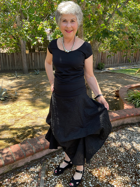 Vicki Z looks glamorous in her skirt in black seersucker. She used Vogue 1639 by Sandra Betzina.