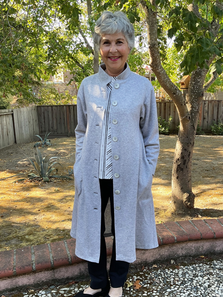 Kathy chose this fabric as a remnant at Britex. It is a good weight and is a woven stretch. She worked an amazing chevron for the center back seam, and did some more matching for the raglan sleeves. I know she loves the comfort of the jacket with the front zipper.