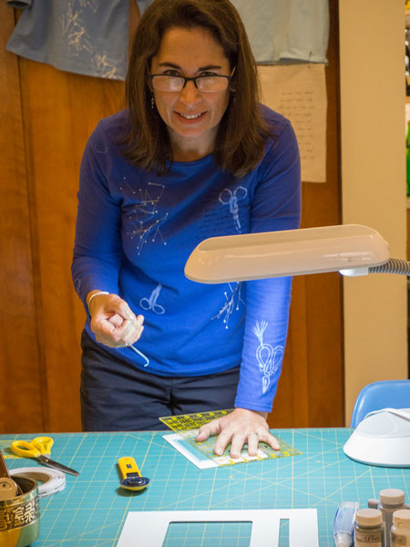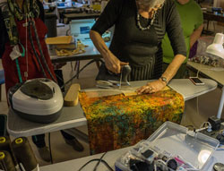 Jane invited Sally Baker to demonstrate the method she uses to make silk screens. Using her Thermofax machine she showed how to make the screens from start to finish, and was very generous in sharing the type and sources of products she uses. After the demonstration students had fun using Sally's screens and paints on their own projects.