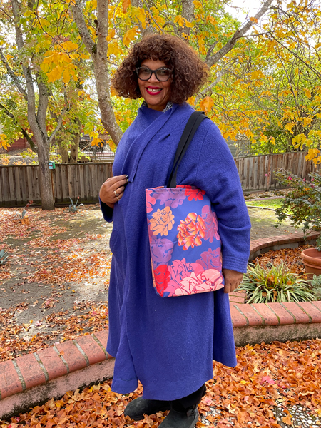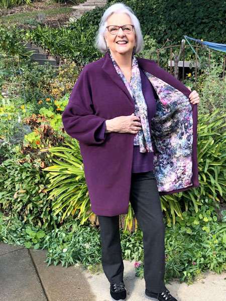Barbara S. looks so stylish. She used my London cape pattern. The wool has the perfect drape and was found on a fabric swap table. She had these unique buttons in her stash.