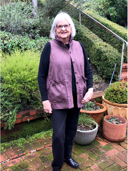 Jane had this interesting textured fabric in her stash and made this simple unlined vest. Her button stash provided the perfect match buttons. The pattern is Vogue 1453 by Sandra Betzina