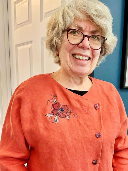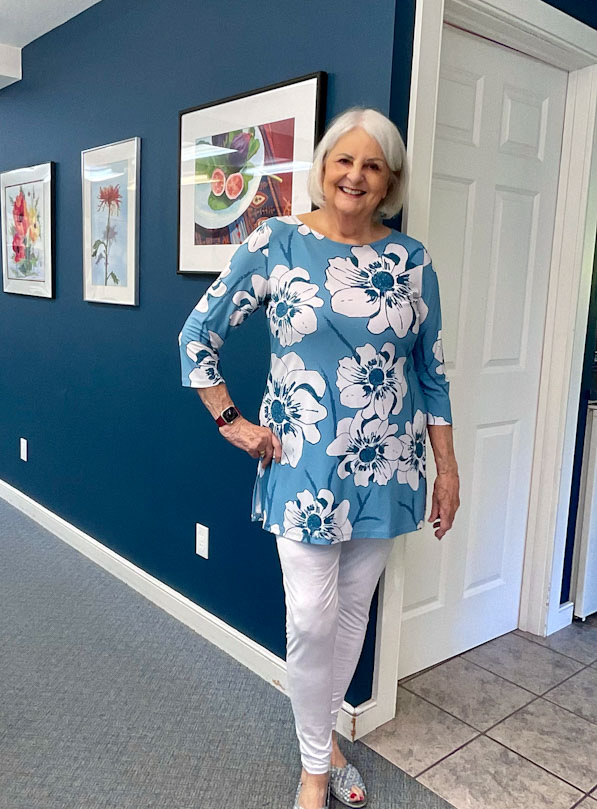 Laurie W is new to sewing and Jane's studio. She just finished her first knit top using Simplicity pattern 1064. She is quickly learning to make attractive tops.