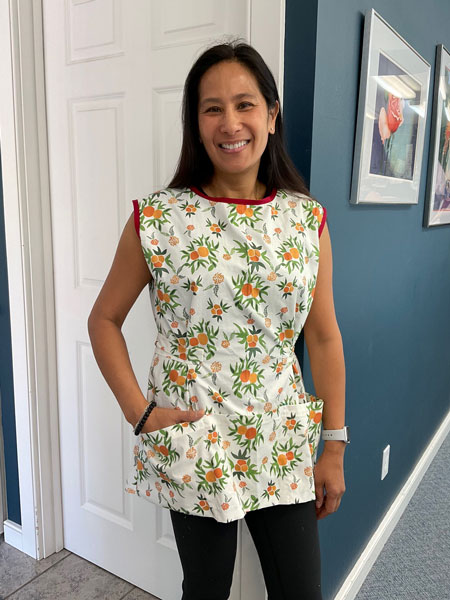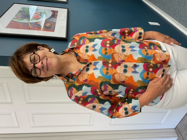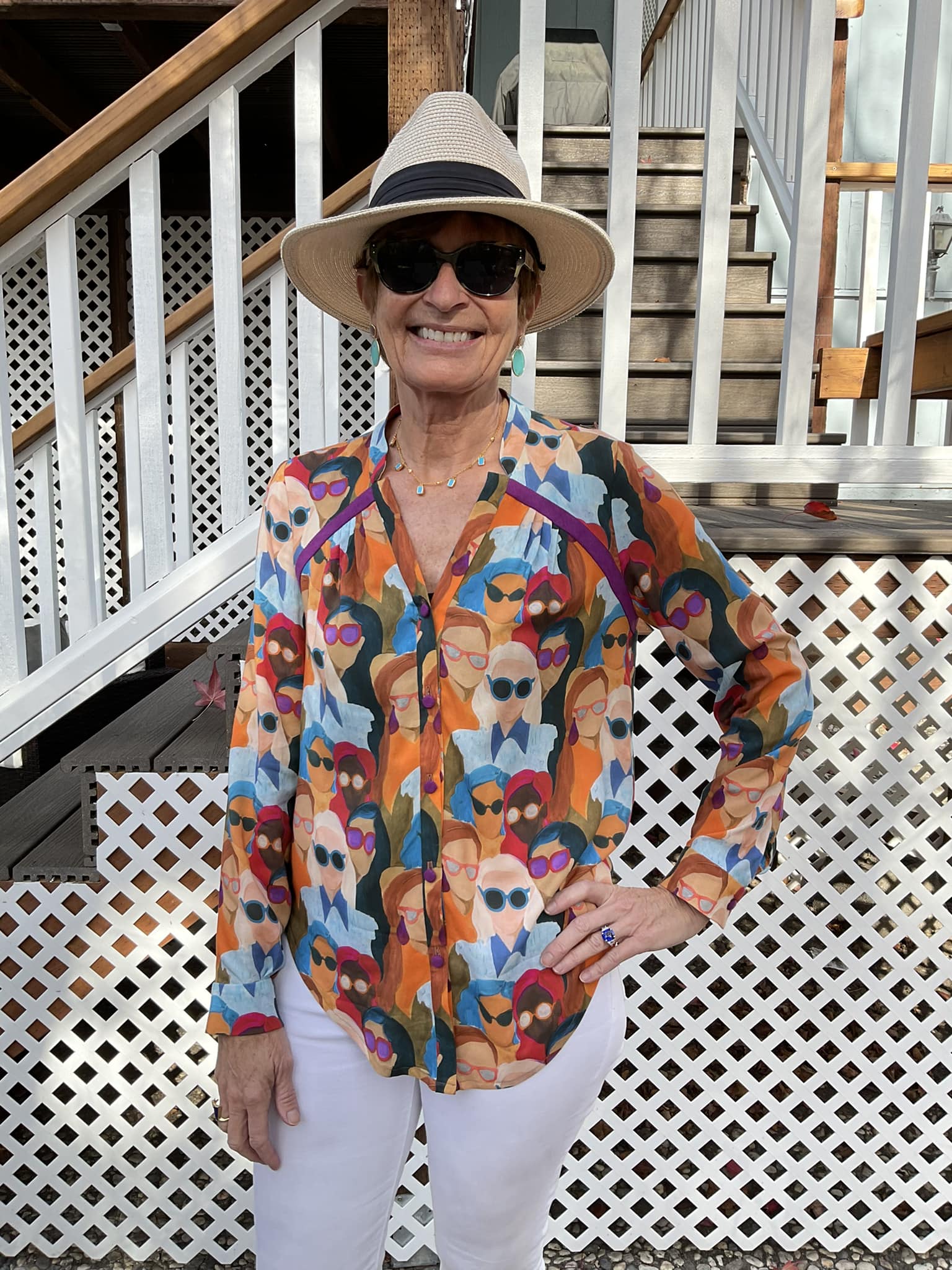Kathy finished her shirt made from this fun print. She used a complementary fabric to insert a trim and cover the buttons. The fabric is rayon. She looks so happy.