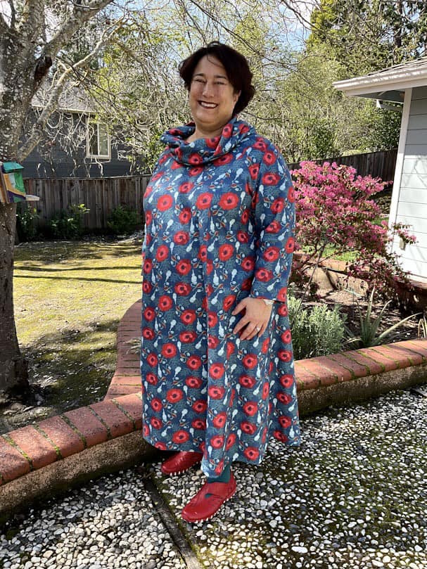 JoAnn finished her dress. Fabric is a printed velour from MarcyTilton.com and the pattern by Merchant and Mills called Trapeze. Long sleeves and a cowl collar were added..