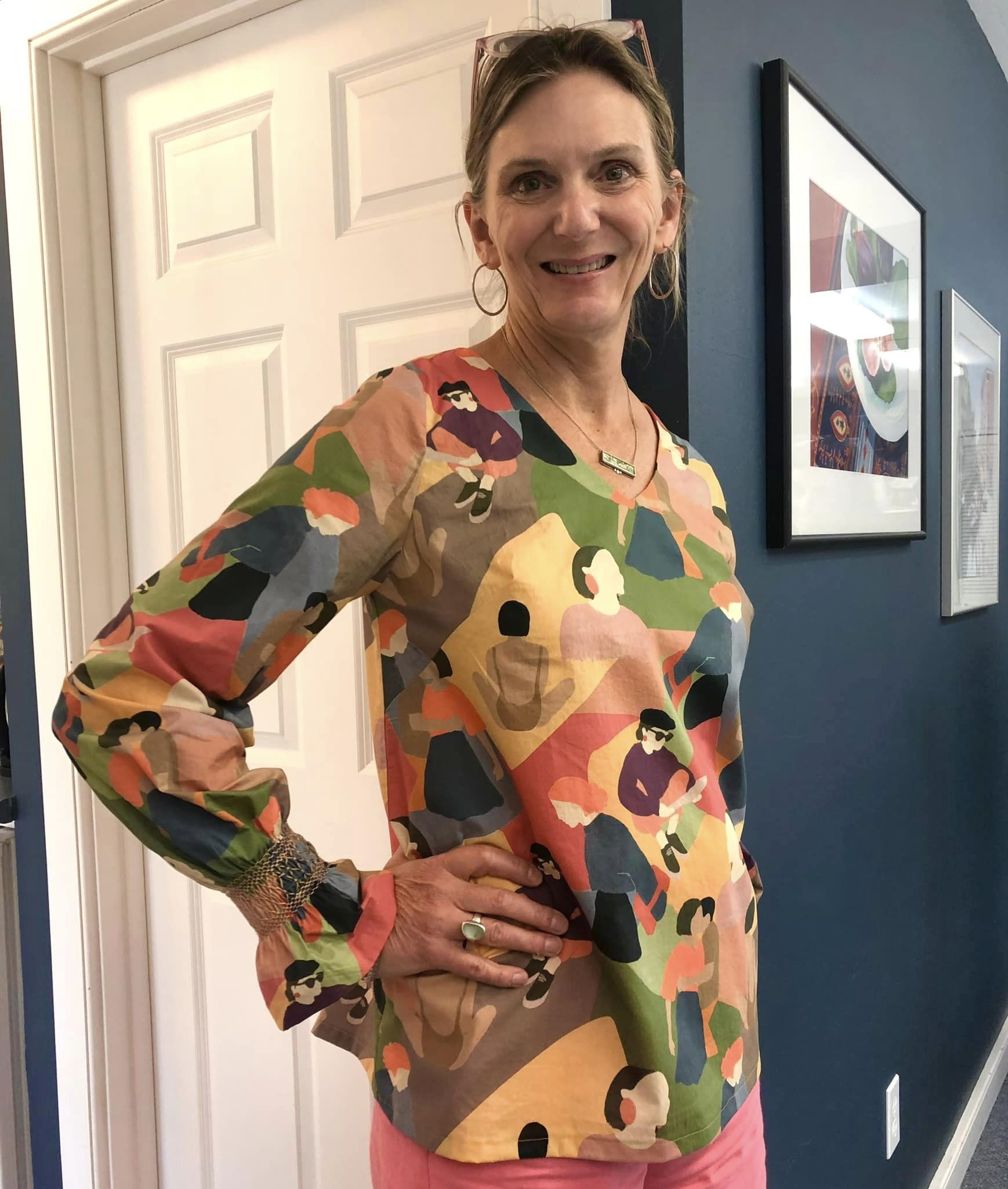 Jane is wearing a top made with fabric she designed and sold by Spoonflower.