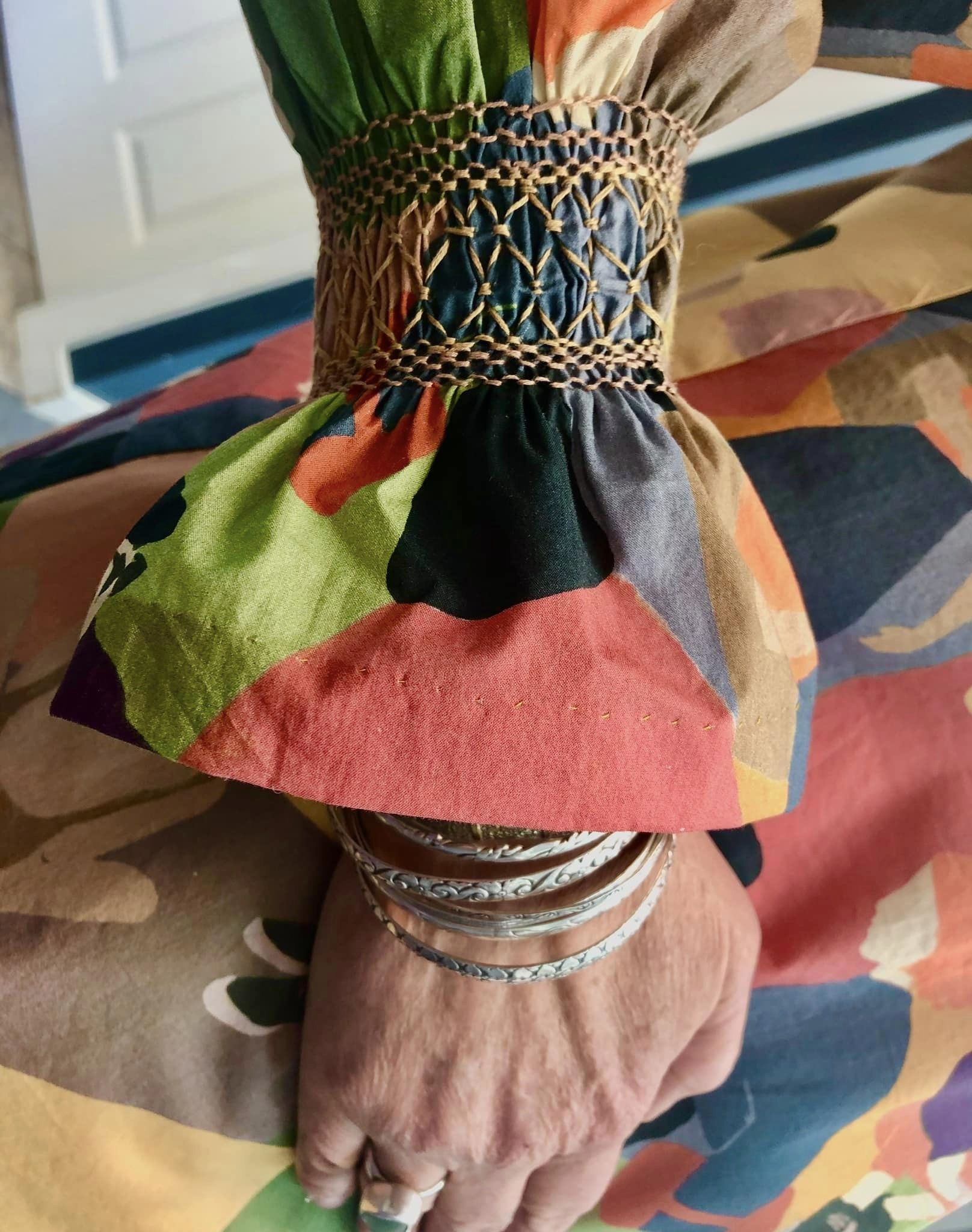 Katherine made this beautiful top. The fabric is from Stone Mountain fabrics in Berkeley by Lady McElroy. This is extra special because Katherine has used her embroidery smocking skills to make the top unique. She has used traditional smocking in a modern way.