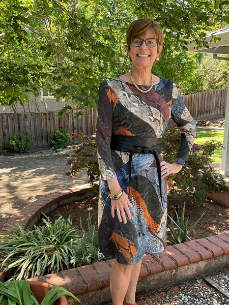 Kathy D used Butterick B6100 tee shirt pattern to make this dress. She just added 14” to the hemline and it’s a perfect dress for this striking fabric.