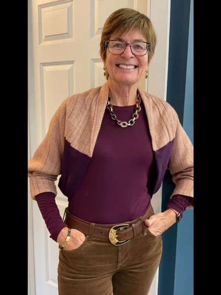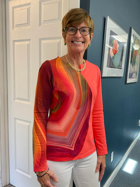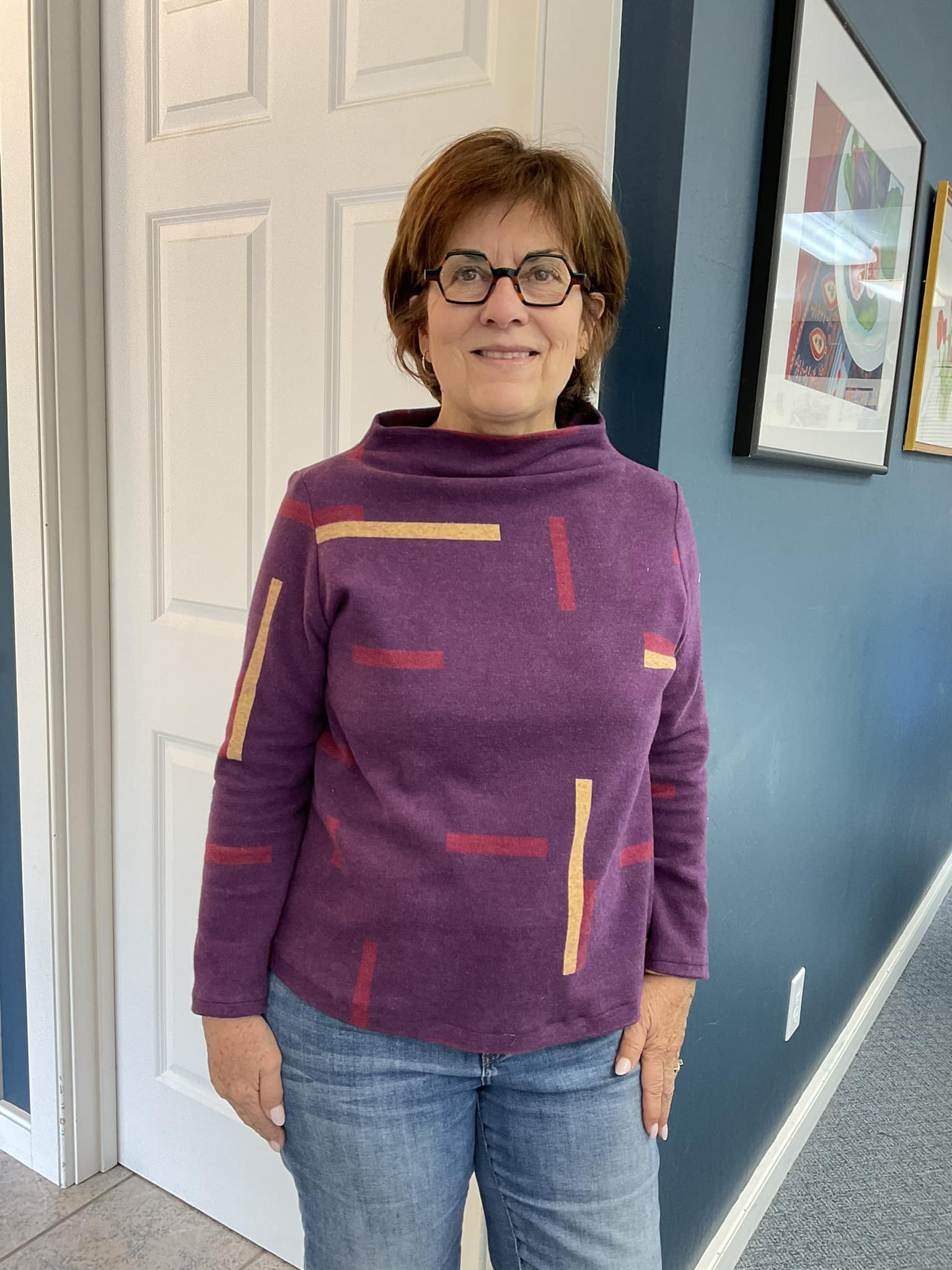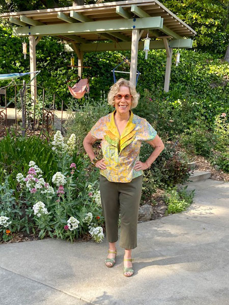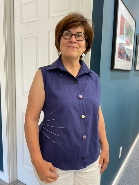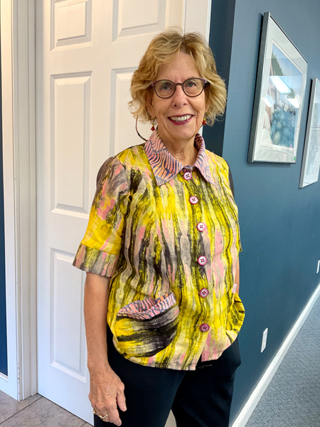 Joy looks fabulous in this top she made using three different coordinating fabrics from Marcy Tilton.