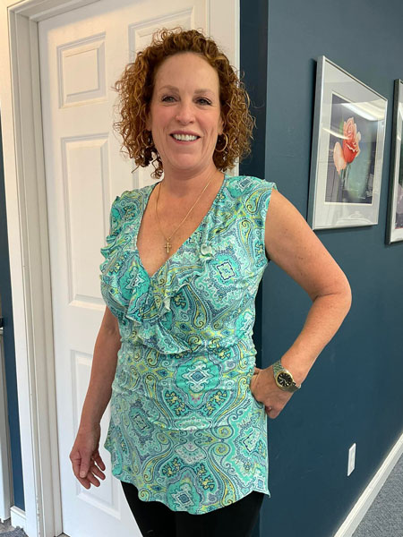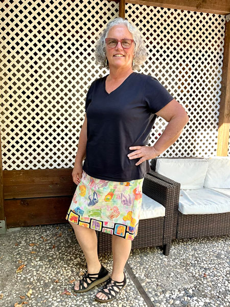 Cathy T. looks amazing in her new top. She and Jane had fun fussy cutting this exciting stretch print fabric.