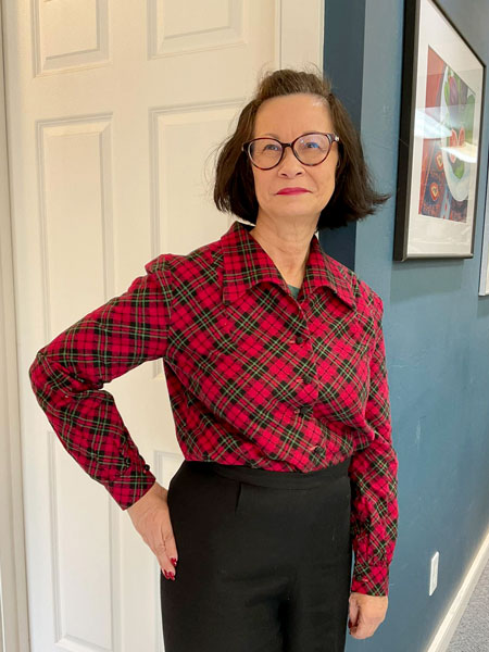 Patty S. made her plaid blouse with a warm flannel. The plaid is printed on the diagonal which creates a softer pattern visually.