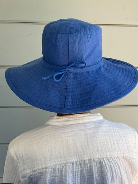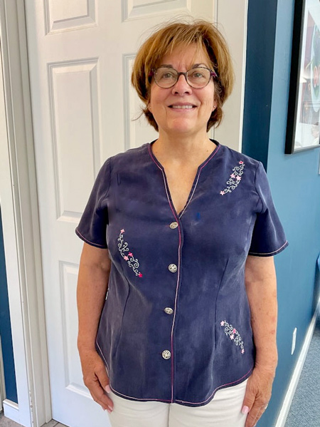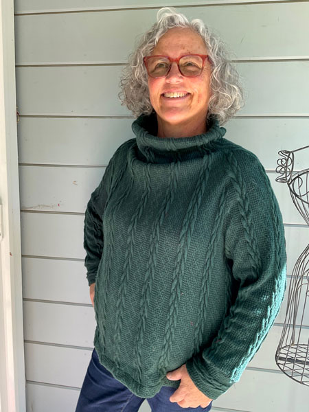 Joy D is wearing her linen tunic.. She used a dress pattern that she loves and just shortened it. This color of linen is exactly her eye color and makes her eyes sparkle.