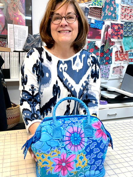 Santina finished the poppin bag she started in Jane's class. She used Kaffee Fasset fabric.