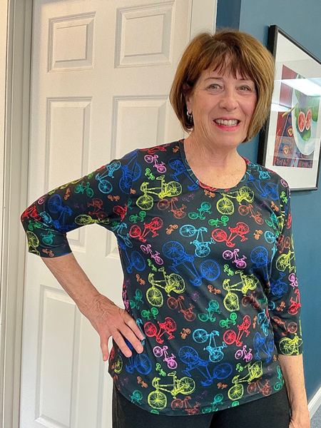 Susan bought my colorful bicycles fabric from Susan bought my colorful bicycles fabric from my Spoonflower shop and made this tee shirt. Her sewing skills are improving with every garment she makes. Susan used her tried and true tee pattern.