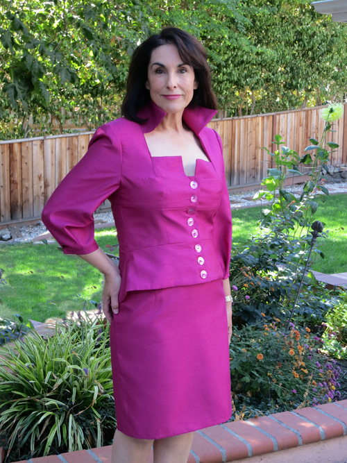 Let me introduce you to Liddy. Over the past few years she has taken many classes at Apparel Arts in Oakland, learning how to draft her own patterns. Using her new knowledge, she has just made this very stylish ensemble! The lightweight wool blouse has a hidden button placket, and the cotton skirt is paneled. These are her own designs. The sleeveless top is a princess line with slits at the hemline and handworked arrowheads.