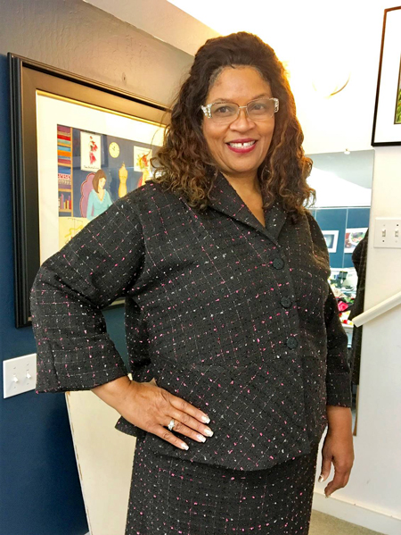 Kathleen's textured fabric came from Stone Mountain and Daughter Fabrics. The color looks great on her, and her necklace complements the trim on this StyleARC Lani WovenTunic.