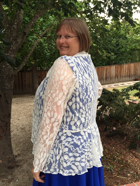 Diana created this top made of stretch lace from her stash. She used Vogue pattern 8885, and finished the edges with her serger.